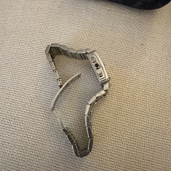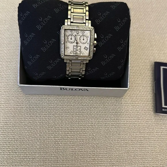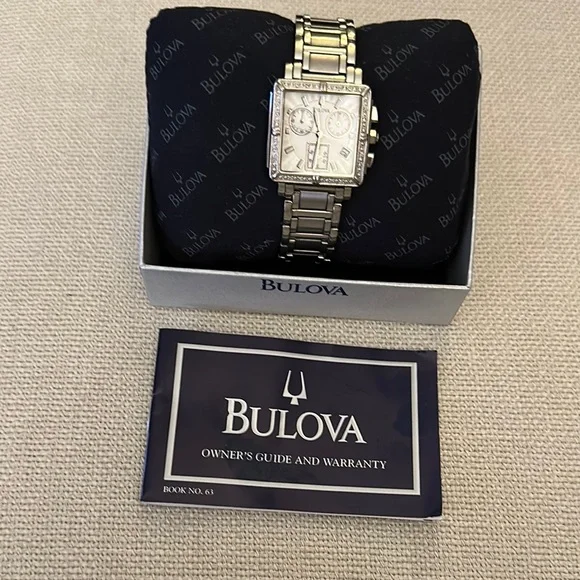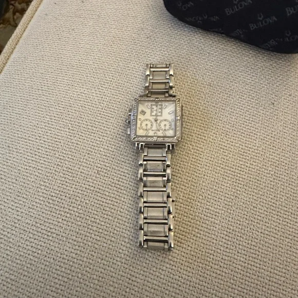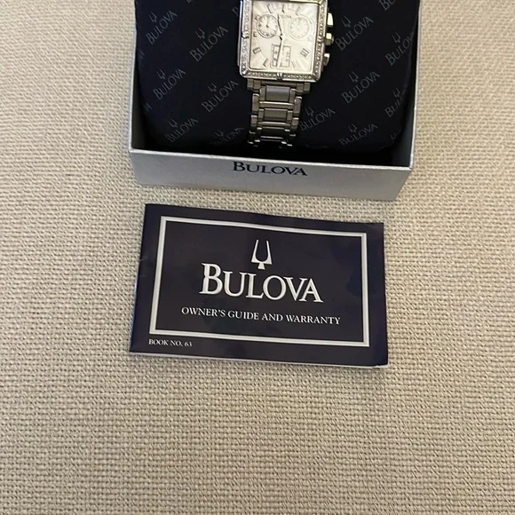 Stylish Bulova watch with a silver chronograph dial. Features a sleek metal bracelet. This was worn by me for about 3 years. I’ve taken very good care of it as you can see. My children got me a Rolex for my 70th birthday so that’s what I wear now. Thank you for looking at my Bulova Watch! I just put a new battery in it!