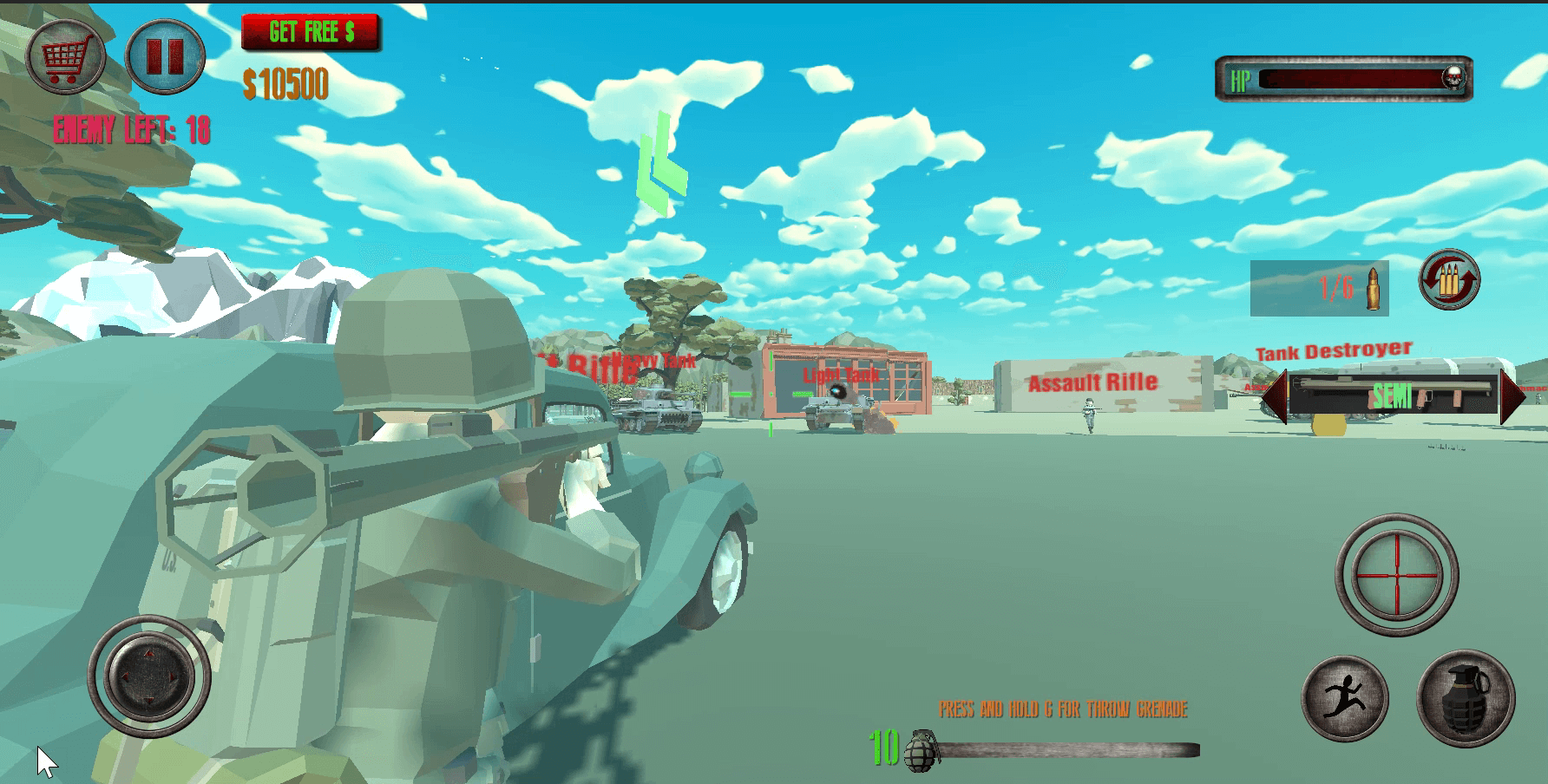 İki tür silah (Makineli Tüfek ve Füze Fırlatıcı), sağlık, menzil, atış aralığı ve doğruluk gibi özelleştirilebilir özelliklere sahip düşman yapay zekası, toplanabilir güçlendirmeler (Gaz ve Cephane), katlanabilir gibi çeşitli özelliklere sahip kapsamlı bir pakettir. Binalar ve dört tür nesneyi görüntüleyen bir radar sistemi: Kayalar, Toplanabilir Öğeler, Binalar ve Düşmanlar.