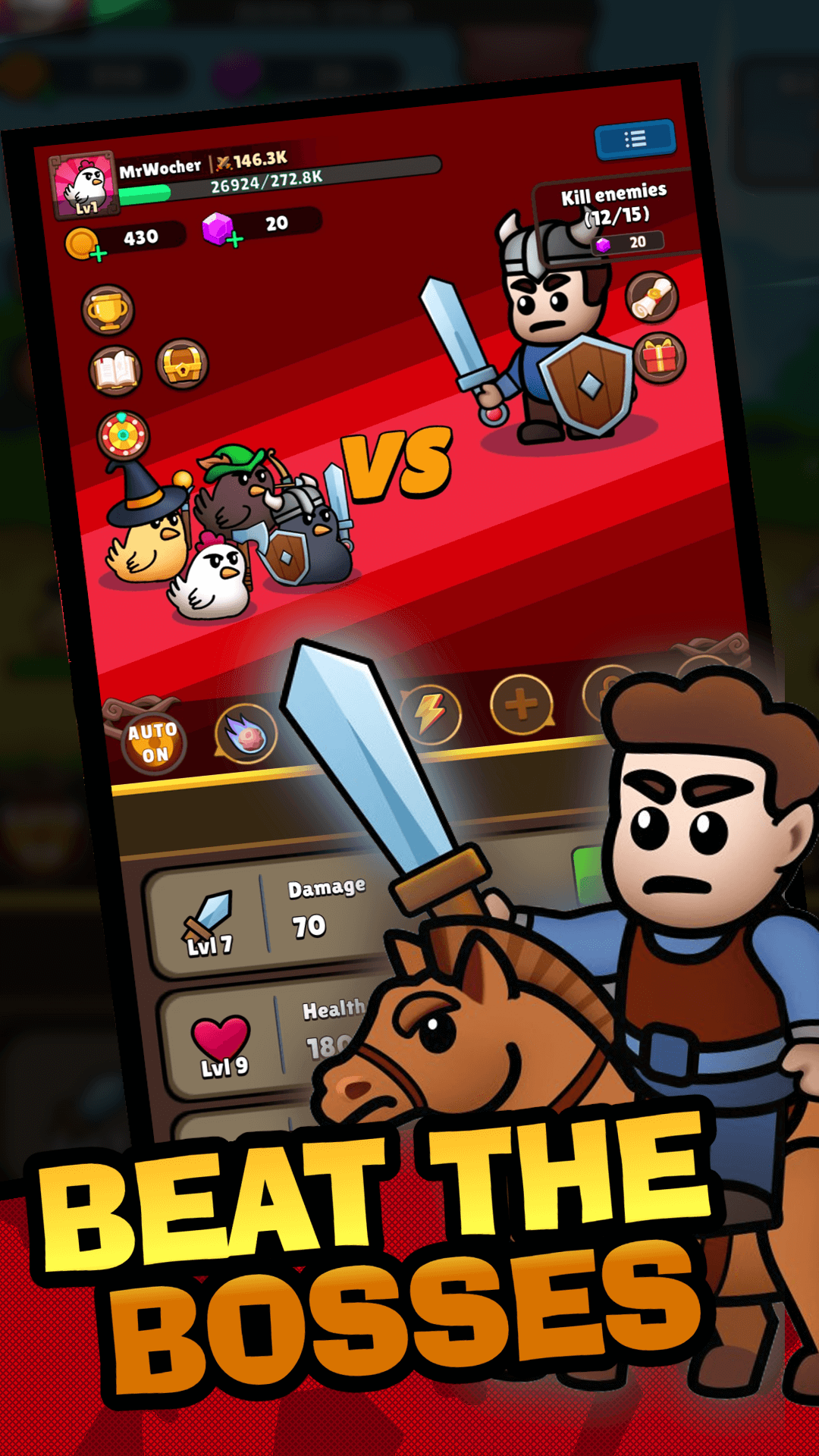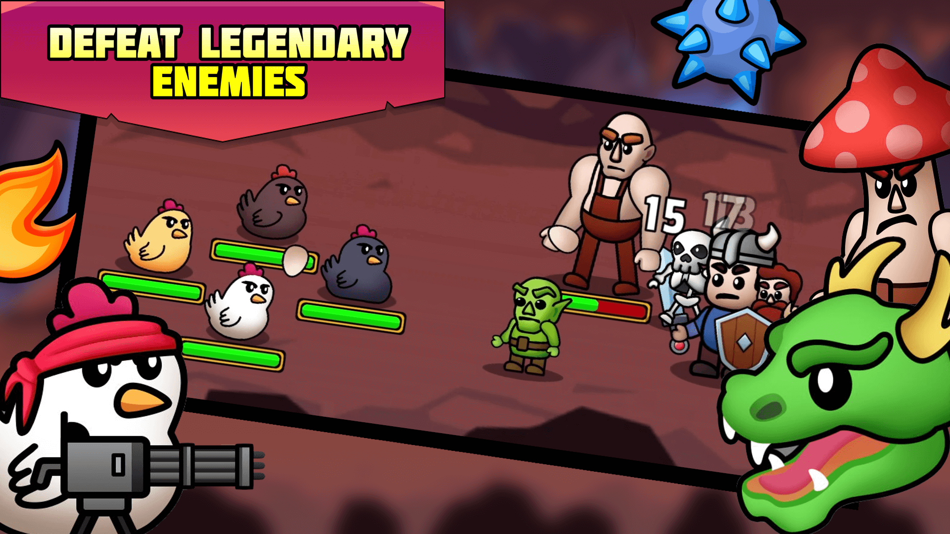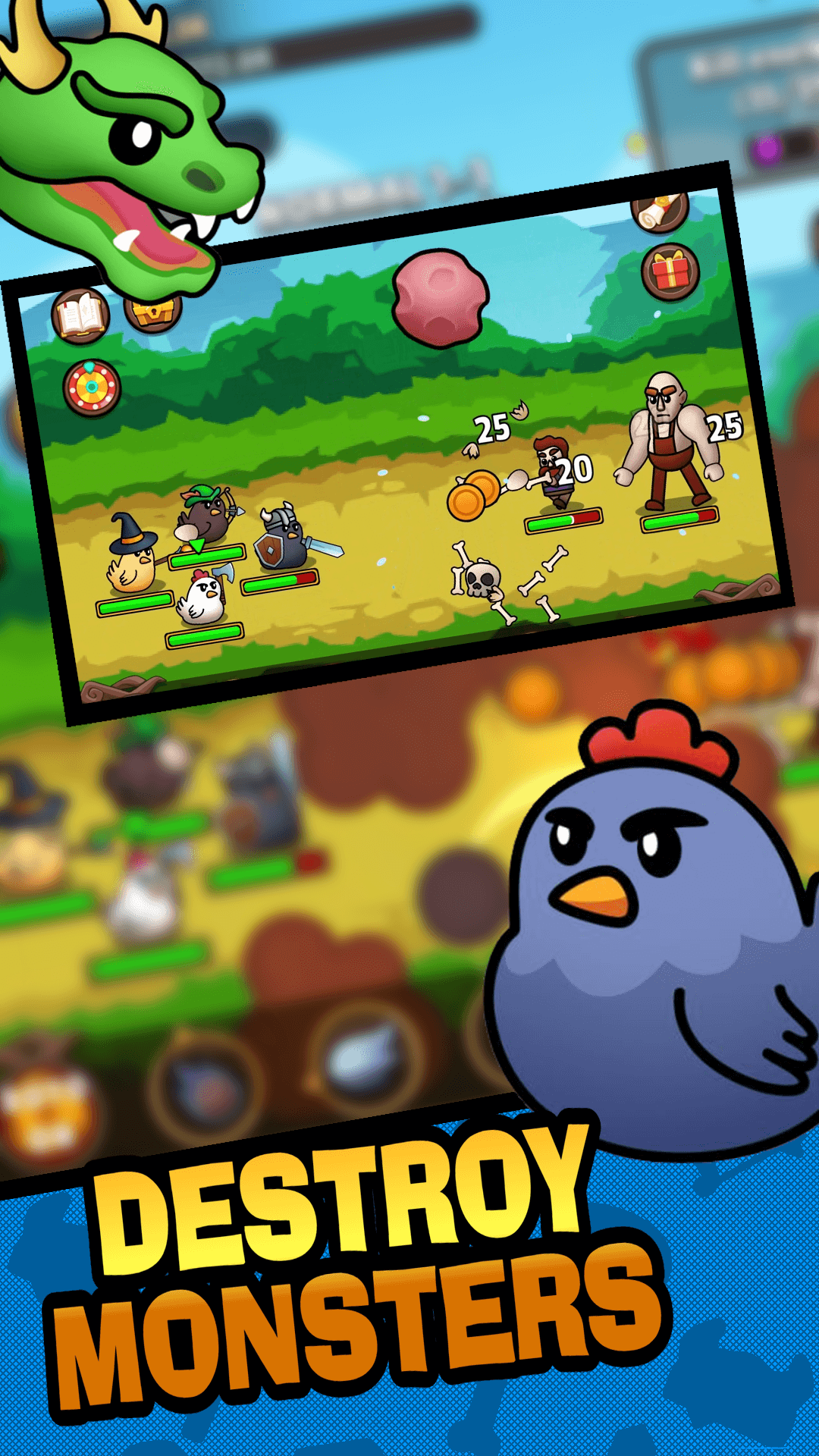 Karanlık güçler canavar dünyasının kaderini tehdit ediyor! Destansı bir gölge savaşında kötü bir avcı olarak canavarlarla savaşın! Efsanevi savaşçılardan oluşan kendi fantezi ekibinizi oluşturmak için güçlü bir kahraman takımı toplayın. Efsanelerle dolu kendi tavuk lejyonunuzu yaratın. Ormandaki salyangozları, tavukları ve diğer canavarları işe alın, yeteneklerinizi geliştirin ve kötü şövalyeyi, savaşçıyı, dövüşçüyü ve iblis avcısını yok etmek için daha fazla efsane açın.