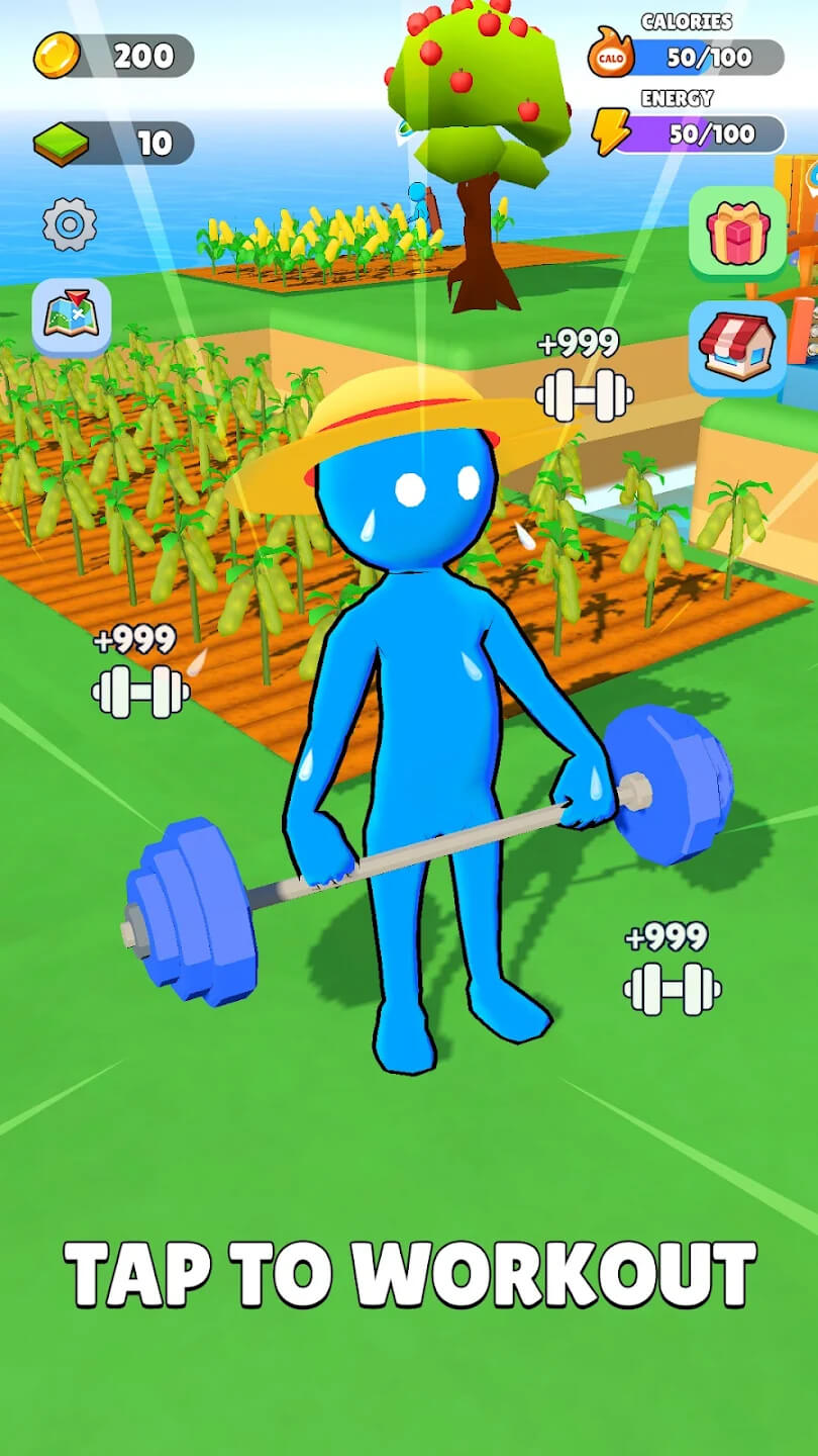 Çiftçilik Eğlencesi: Muscle World de para birimi olan kaloriyi kazanmak için farklı mahsuller yetiştirin ve hasat edin, hayvan yetiştirin ve meyve toplayın.